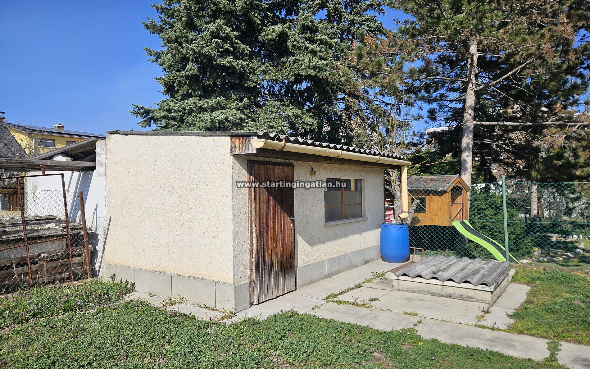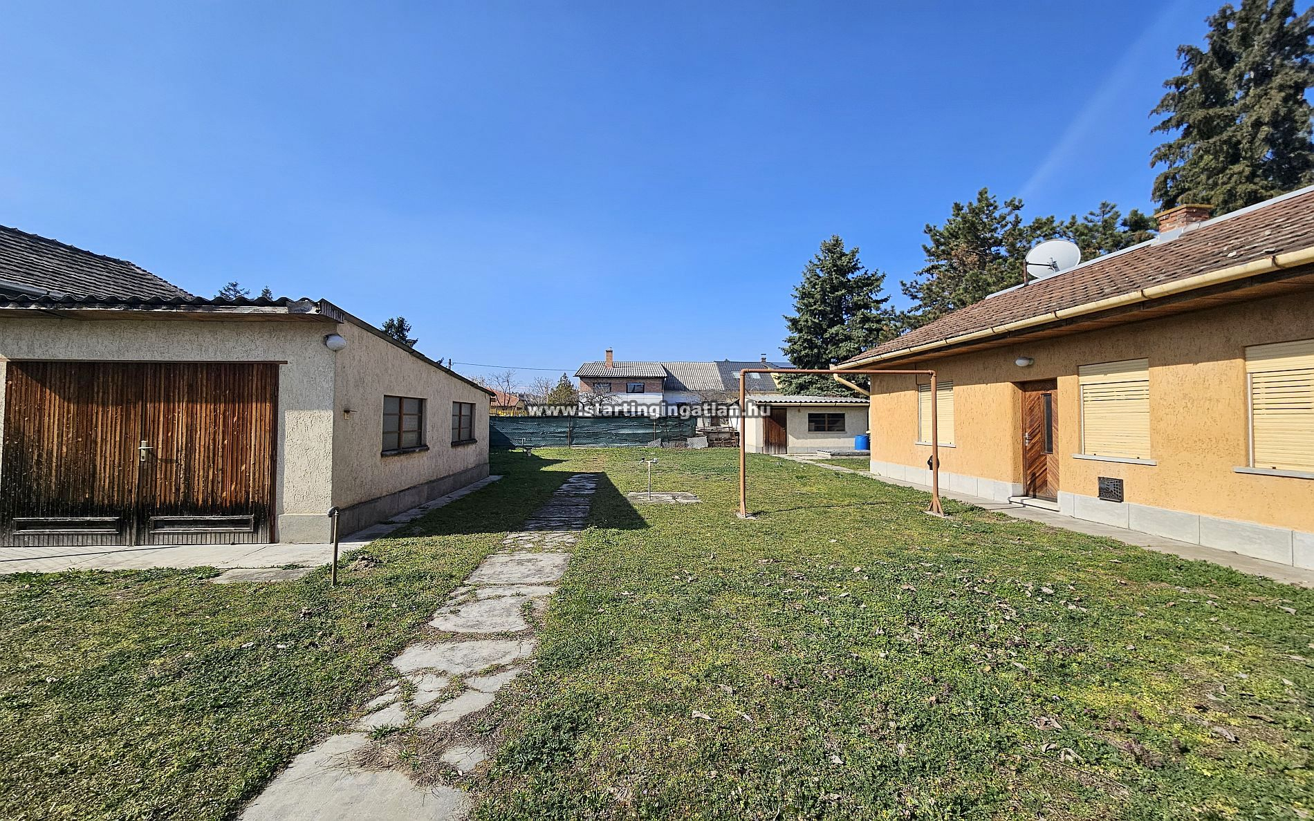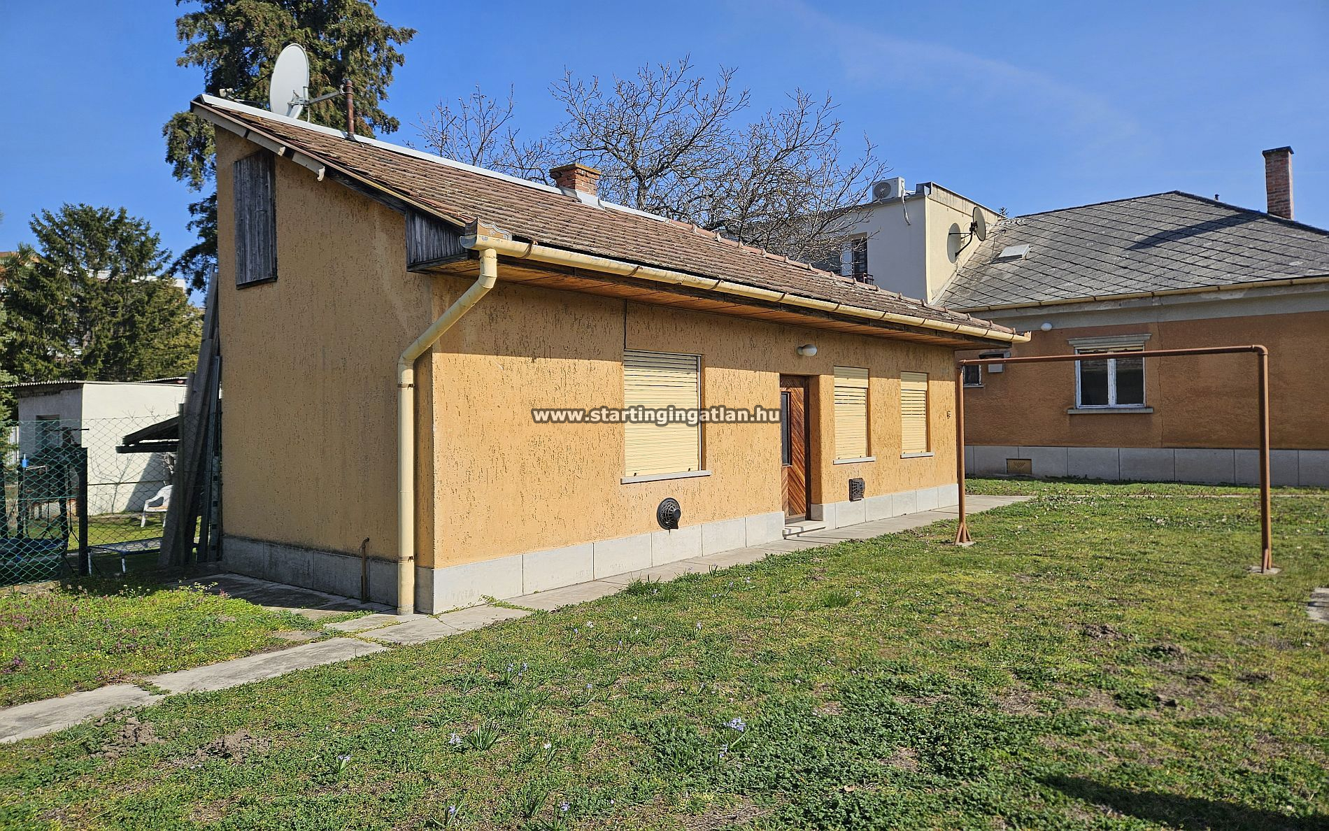 Az 521 nm-es telken két különálló épület helyezkedik el, ami már önmagában is számos irányt megnyit. A nagyobbik ház a 60-as években épült, 89 m² alapterületű, felújítást igényel, viszont szerkezeti adottságai megbízható alapot adnak. Beton födémes kialakítása és masszív tetőszerkezete lehetővé teszi a tetőtér beépítését, így aki nagyobban gondolkodik, itt nem fog falakba ütközni. A belső terek alakíthatók, a ház alatt pince található, a padlás könnyen elérhető, minden adott egy átgondolt átalakításhoz.