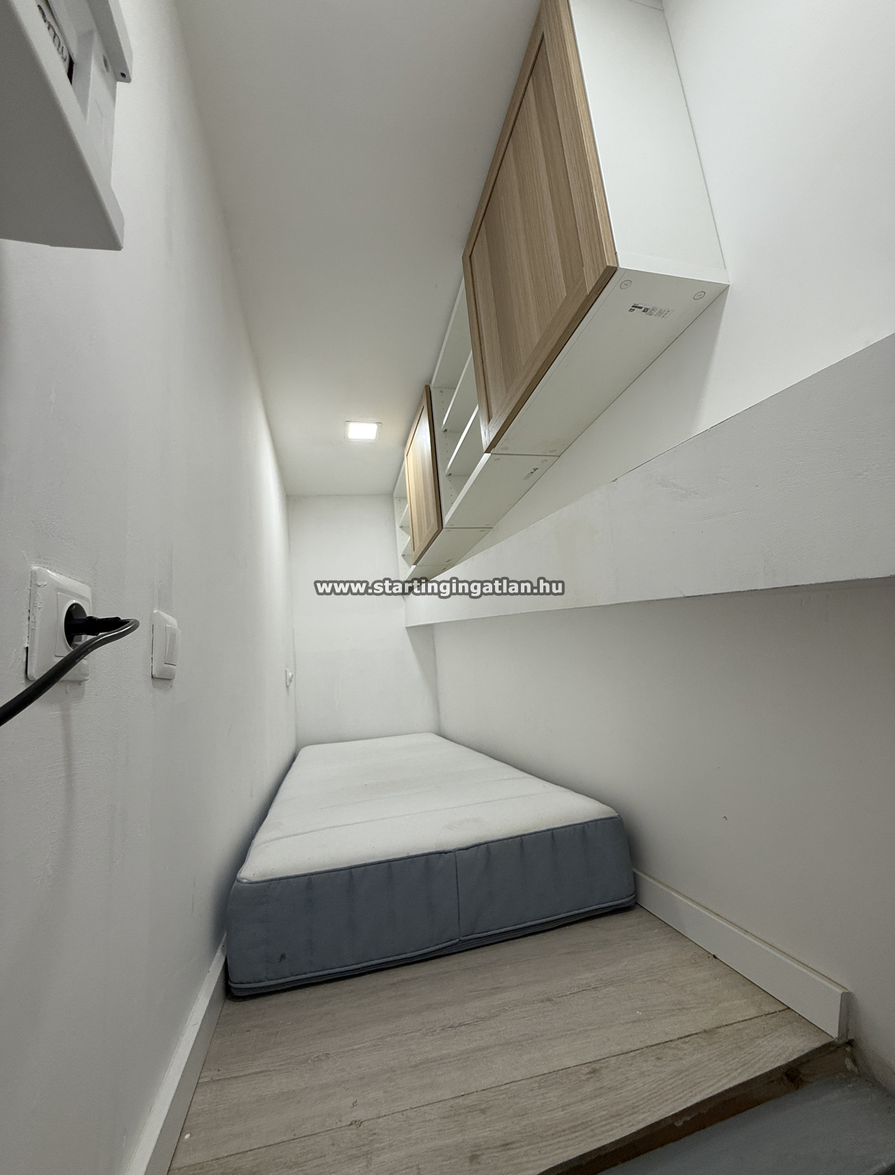 A lakás úgy lett megtervezve, hogy kis alapterületen is teljes értékű, kényelmes életet biztosítson egy ember számára. A földszinten található, a folyosóról nyílik, mégis a csendes belső udvarra néz, így nyugalmat ad a városi pezsgés közepén. A tér okosan tagolt: saját fürdőszoba WC-vel és zuhanyzóval, kompakt, mégis teljes értékű konyhával, valamint egy galériás hálórésszel, ahová stabil falépcső vezet, kényelmes matraccal és beépített tárolókkal.